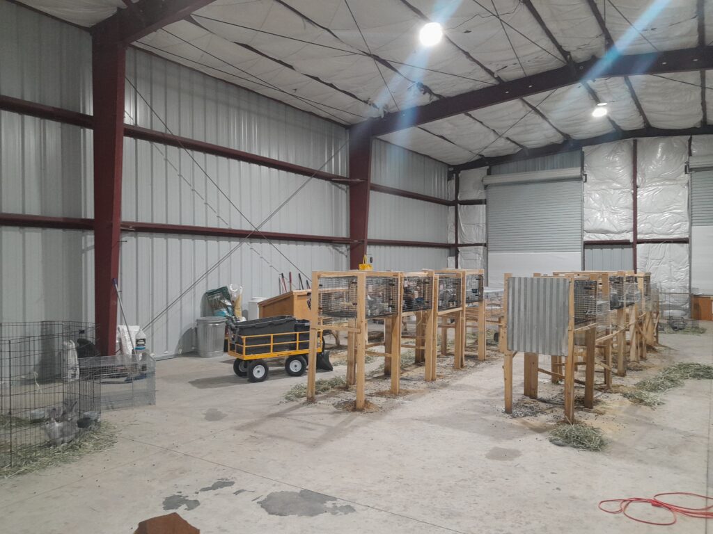 There are no stacked cages at Rit Shabbit, and we’re working on moving to an open pen arrangement in 2026. (No More Cages!!) Happy bunnies have room to run fast (zoomies) and binkie (a sudden jump/twist motion) in joy.